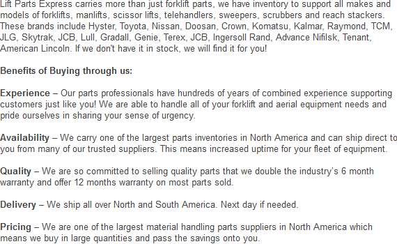 For your entire fleet of forklifts, we provide the best deals on all our parts. Give us a call today if you are interested in receiving a price estimate on our parts or attachments. Our number is: